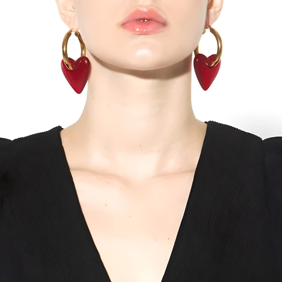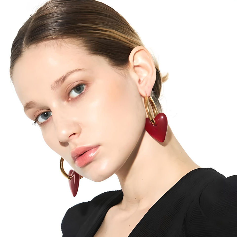 Discover the essence of vintage charm combined with a modern twist in our Red Heart-Shaped Drop Earrings. Designed for the woman who adores making a statement with her style, these earrings are more than just an accessory; they are a declaration of boldness and beauty. With their unique geometric heart design, wrapped in a stunning golden hue, they perfectly blend classic elegance with contemporary flair.